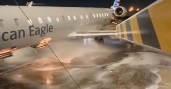 Рабочий международного аэропорта Даллас/Форт-Уэрт закончил заправку самолёта, но потерял контроль над шлангом, когда пытался отсоединить его. На кадрах легковоспламеняющаяся жидкость хлещет по асфальту.