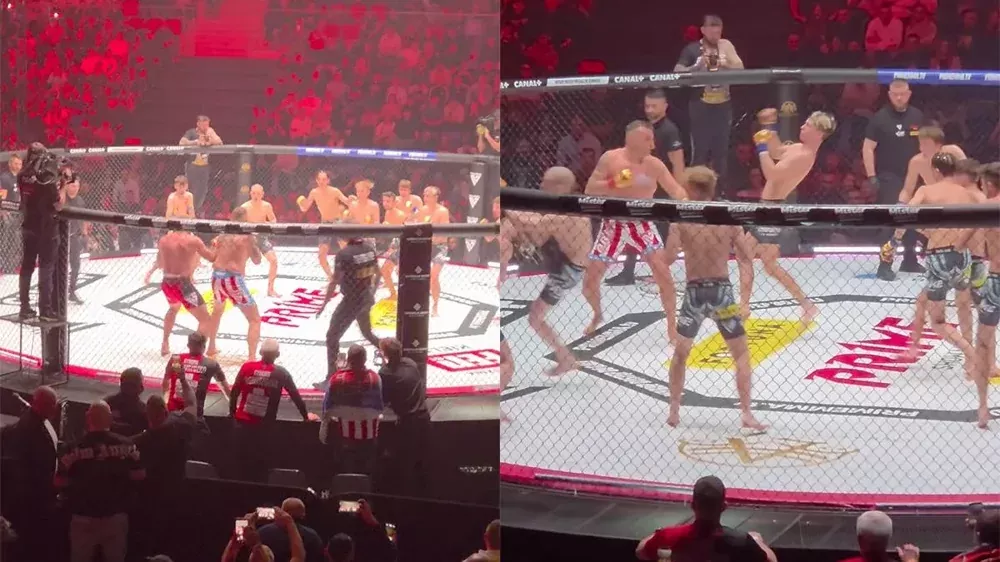 На одном из боевых мероприятий в Польше обычный поединок превратился в настоящий цирк: в октагоне одновременно оказалось около десяти участников! Ситуация выглядела настолько забавно и абсурдно, что зрители не могли сдержать смеха, а кадры "массовой схватки" быстро разлетелись по сети.