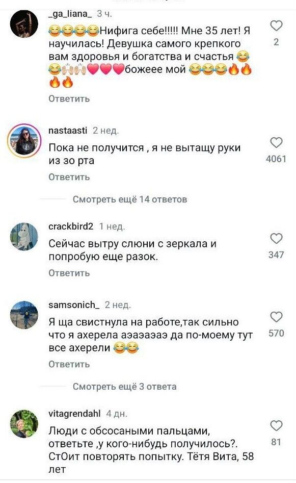 Девушка продемонстрировала простую технику, в которой нужно подогнуть язык внутрь и прижать его пальцами - тогда получится громкий, резкий свист.