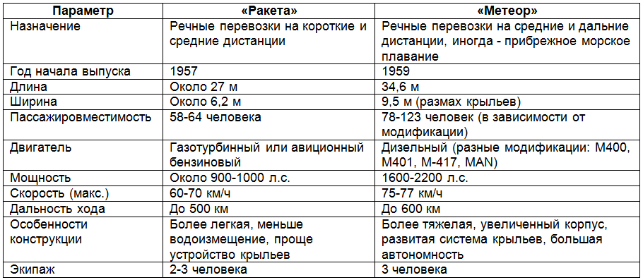 Наши корабли рассекали по Темзе! Имиджево это был очень крутой проект. Он наглядно показывал уровень технического прогресса в СССР.В чем отличие "Ракеты" от "Метеора"? "Ракета" - первопроходец. Небольшая (27 метров), простая в обслуживании, рассчитанная на 60 пассажиров. Использовала авиационные двигатели, потому что тогда в авиации был избыток технологий, а в судостроении - дефицит."Метеор" - эволюционно новый этап. Длина 34 метра, вместимость до 123 человек, дизельные моторы, большая дальность хода. Корпус "Метеора" изготавливался из дюралюминия, а крылья - из нержавеющей стали. Он был надёжнее и экономичнее. И красивее - по мнению пассажиров.Для любителей технических подробностей собрана информация об этих теплоходах в таблице:
