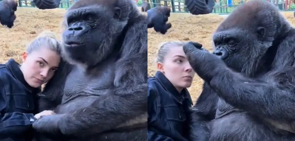 Смотрительница зоопарка подкармливает самку гориллы вкусняшками втайне от самца.