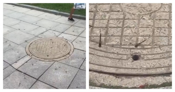Очевидец запечатлел стрекоз, охотящихся на комаров. Назойливые насекомые вылетали из канализационного люка и тут же становились пищей.