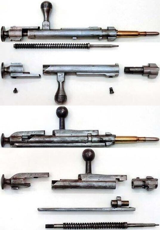 Затворы Нагана и Мосина в собранном и разобранном виде. Очевидно, что нагановский затвор при внешней лёгкости и простоте заметно проигрывает затвору Мосина в надёжности и технологичности изготовления.1. Затвор Мосина не может быть назван "модернизацией" затвора Нагана ни при каких обстоятельствах.2. Ложь про общность предохранителей тоже не выдерживает критики. Да и флажковый предохранитель Наган расположил с левой стороны ствольной коробки.