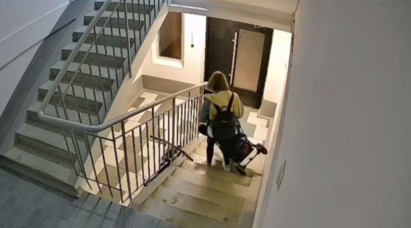 Женщина чуть не выронила малыша, когда спускала коляску по лестнице. После она попыталась выбить ногой дверь и рухнула вместе с ребёнком на пол.Также она колотила коляской по стенам лифта.