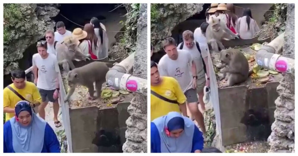 Обезьяна застала врасплох туристку, поднимающуюся по горной тропе. Следовавший за женщиной парень не растерялся и провернул с животным похожий трюк.