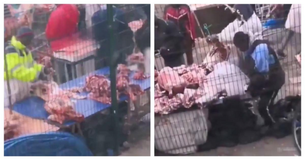 Тем временем в пригороде ПарижаВ Витри-сюр-Сен сотни килограммов мяса разделываются на улице на деревянных досках и продаются без каких-либо гигиенических норм.