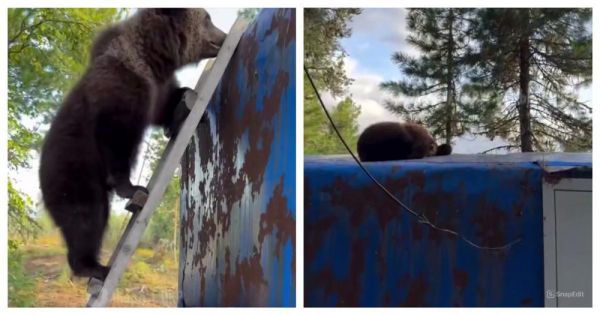 В ЯНАО медведь навестил вахтовиков и вздремнул на их вагончике.Мужчина снял на видео медведя, который вышел к городку вахтовиков. Зверь подобрался к жилому вагончику и воспользовался деревянной лестницей, чтобы забраться на крышу. Хищник проигнорировал внимание оператора, спокойно устроился на крыше и уснул.