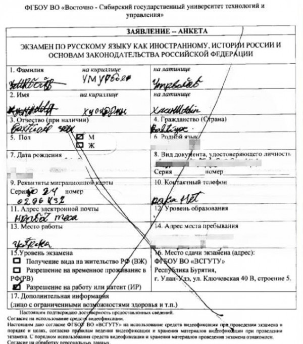 В Восточно-Сибирском государственном университете технологий и управления (ВСГУТУ) в Бурятии начата проверка после выявления подозрительных фактов выдачи сертификатов о знании русского языка иностранным гражданам. Поводом стали инциденты в Костромской области и Иркутске, где у мигрантов из Узбекистана были обнаружены свежие сертификаты, но их реальные знания русского языка оказались минимальными - мужчины с трудом могли составить простейшие фразы.В экзаменационных бланках этих "выпускников" также были обнаружены ошибки - многие даже собственное имя не смогли написать правильно.