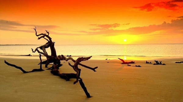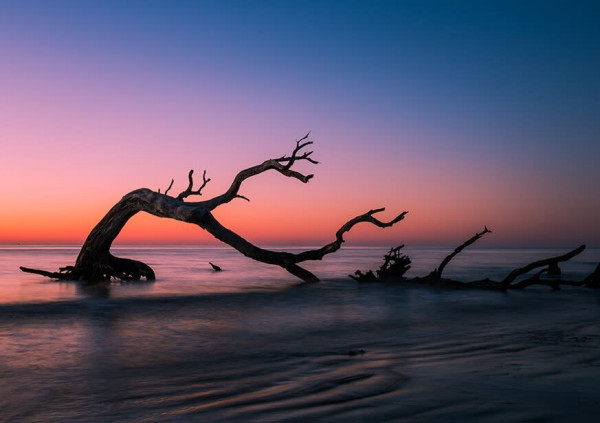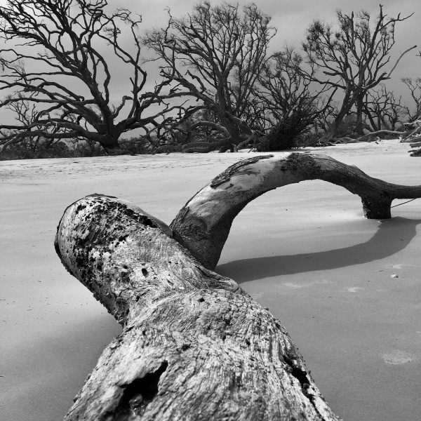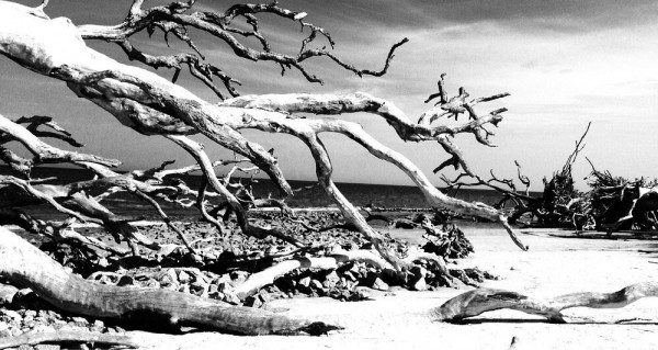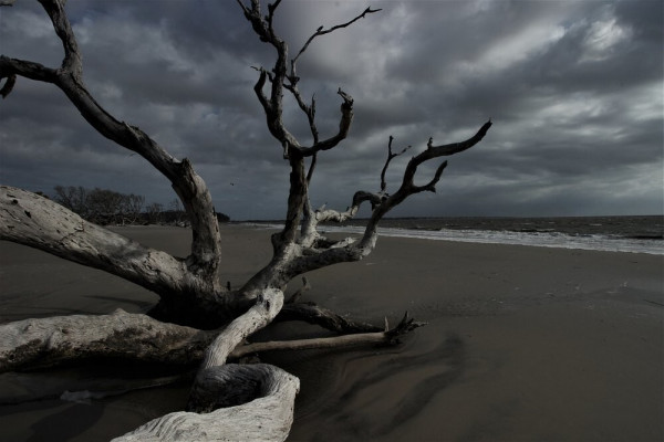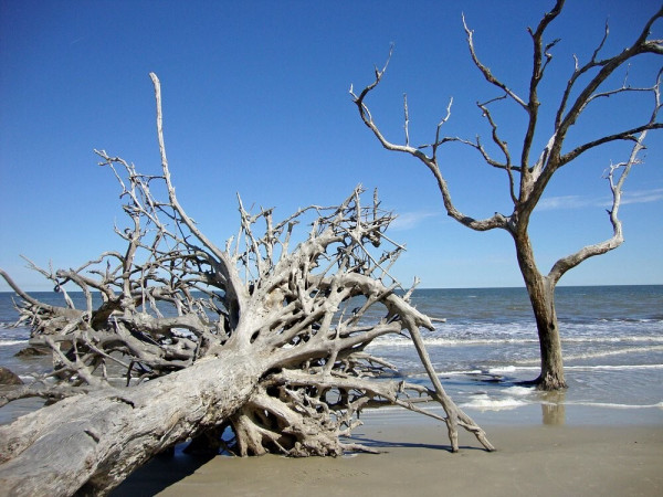 Представьте себе безлюдный берег, усеянный причудливыми соснами и дубами. Они застыли в немом крике, словно выбеленные солнцем скульптуры на фоне идиллического морского пейзажа. Одни деревья лежат полностью обнажёнными, другие будто прорастают из песка, являя миру свои остовы.