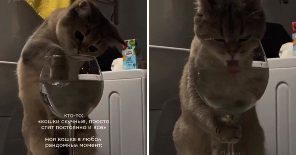 Кошечка пьет воду из бокала, но делает это очень элегантно. Чтобы бокал не упал, она придерживает его пушистой лапкой. Ничего милее сегодня уже не будет.