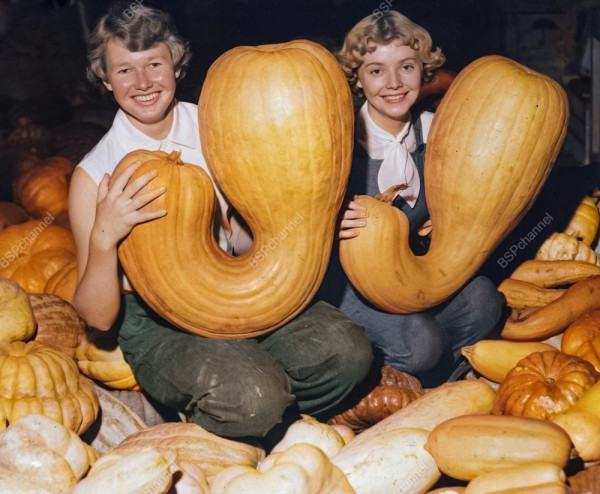 Хизер Хейвуд из Нарромайна и Энн Твиди из Уолган-Вэлли на Королевской пасхальной выставке с гигантскими тыквами "Багл Грамма".