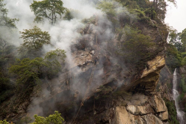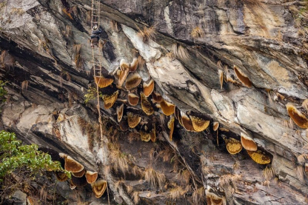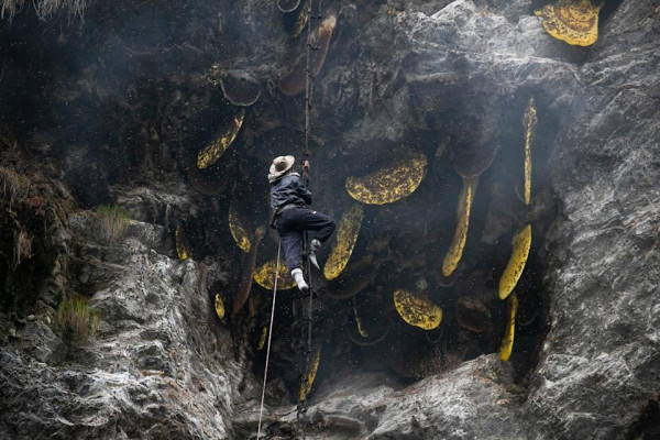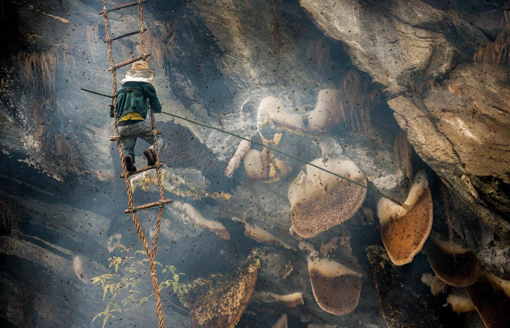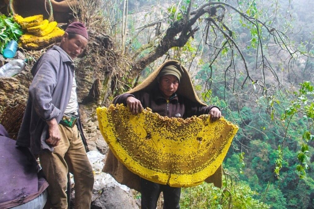 Поэтому на добыче мёда гигантских пчёл местные построили грубую и крайне суровую индустрию. Они задымляют пчёл кострами, после чего взбираются на десятки метров вверх по отвесным скалам при помощи веревочных лестниц с деревянными перекладинами. Без страховки и какой-либо защиты. Полученный таким образом товар стоит безумно дорого, в среднем 1 доллар за грамм, но основную прибыль получают торговцы красным мёдом. Бортники-альпинисты же зарабатывают на смертельно опасном ремесле ровно столько, сколько нужно, чтобы прокормить семью.