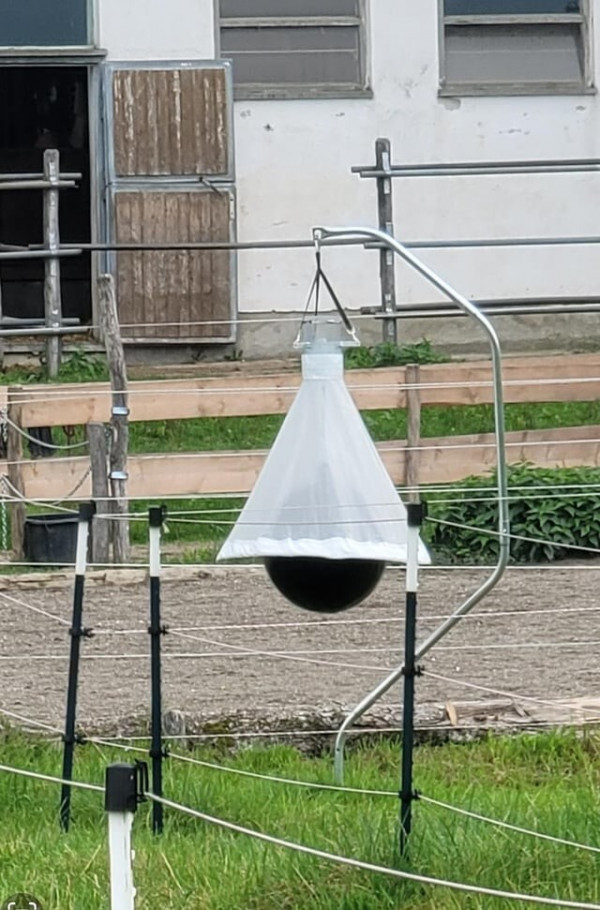Ловушка для слепней. От нагретого в солнечный день надувного чёрного шара, висящего внизу ловушки, исходит тепло. Попав на него, самки слепней (а кусаются только они) поднимаются в контейнер, откуда они не могут сбежать.
