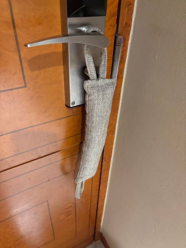 Стоппер - ограничитель для двери. Если надеть петлю на дверные ручки с обеих сторон, то подушка не даёт двери защелкнуться, чтобы можно было занести багаж.