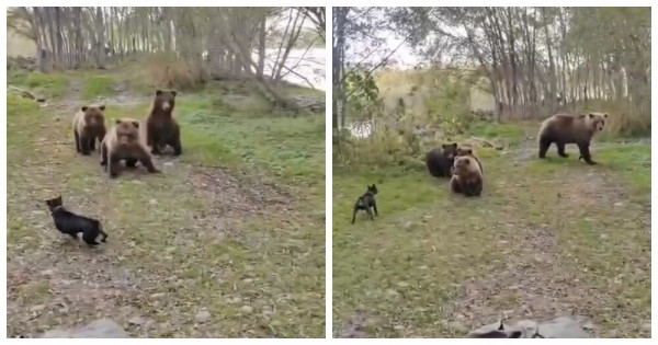 В лесу мужчина стал свидетелем неожиданной сцены: его собака подошла к медведице с медвежатами и начала их зазывать к игре. Медведица настороженно наблюдала, но не проявила агрессии.