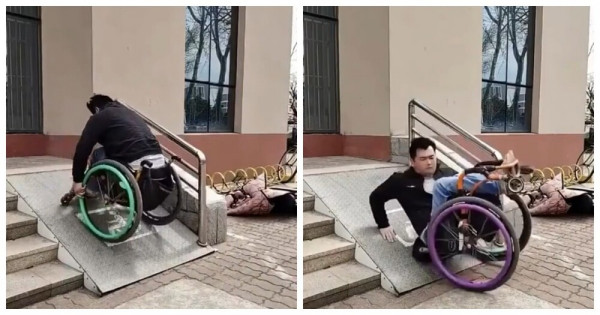 На видео показан установленный , но совершенно непригодный к использованию пандус для инвалидных колясок . Уклон слишком крутой, и нет никаких ограждений, предотвращающих падение. Похоже, что он сделан скорее для красоты, чем для практической пользы.