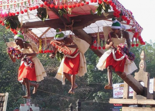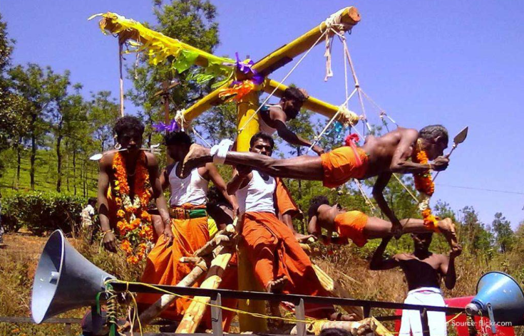 Каждый год на юге Индии красочно проходит Фестиваль Гарудан Токкам, что дословно означает Висение орла. Гарудан - это такой мифический персонаж, который считался царем птиц. То есть он наполовину человек, наполовину орел, как кентавр, только птица. Вертится весь праздник вокруг главных богов в индуистском пантеоне - Кали и Вишну. Когда-то, когда Кали мучилась от жажды, Вишну послал к ней бога-птицу Гаудана (который также был еще одним ездовым животным Вишку), чтобы его кровь могла утолить жажду Кали.