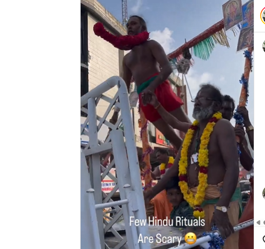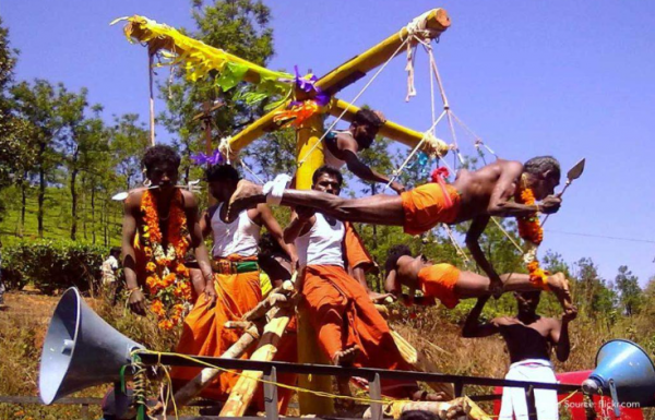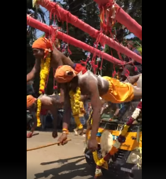 Крючки пробивают через кожу так, чтобы она не порвалась, и можно было подольше повисеть на дереве. Сначала все наряжаются в праздничный маскарадный костюм птицы и танцуют, звезда танца (заранее вызвавшаяся добровольцем) в конце танца становится "орлом". Все аккуратно поднимают его на перекладину-дерево. Если идет кровь, то не страшно, богине Кали наоборот такое только в радость.