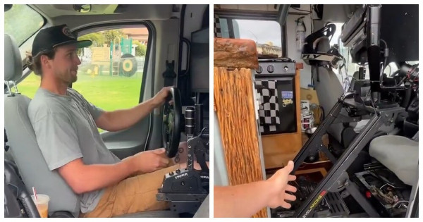 Пассажирское кресло парень превратил в виртуальную капсулу скорости: развернул на 180 градусов, прицепил руль, педали и монитор. Путешествует он только с псом - и тот от такой перестановки "ни капельки не расстроился".Внутри также есть мини-кухня, кровать и туалет, а в свободное время Дэн стримит на YouTube. Как вам сетап?