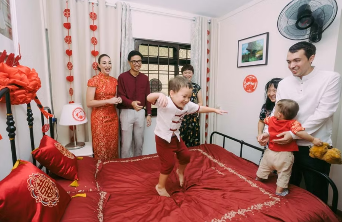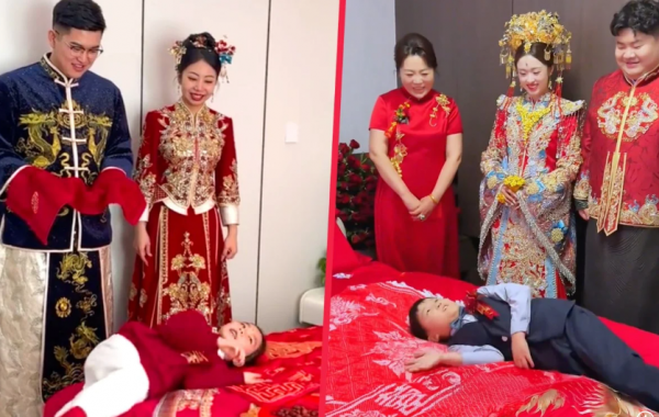 Традиции уже очень много веков и называется она гун чжуан или "переворачивание на кровати". Она зародилась на севере Китая, но с тех пор распространилась по всей стране, потому что цепляет за больное. Мальчик дошкольного возраста или из начальной школы должен кататься по красиво украшенной кровати, которая станет брачным ложем молодых. При этом должен напевать стишки, чтобы у пары были дети, а жизнь была благополучна. Его заранее учат фразам: "Эта кровать широкая, в следующем году она будет заполнена горами золота и серебра" или "Эта кровать длинная, и вскоре в этом доме поселится выдающийся ученый".