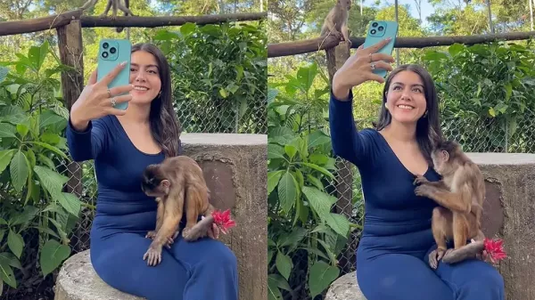Наглая обезьянка «нашла сокровище» у посетительницы парка