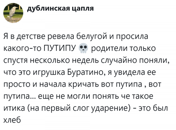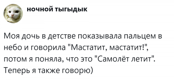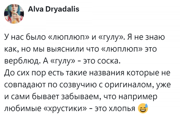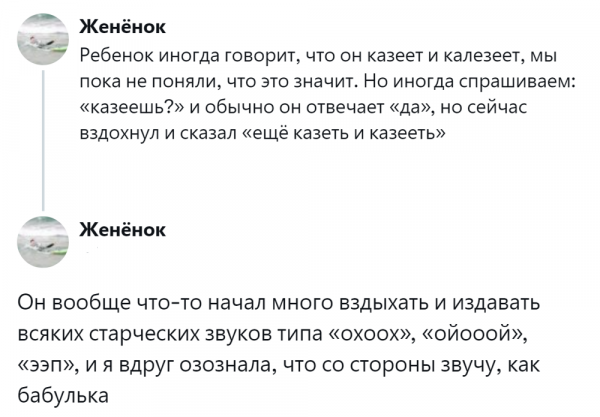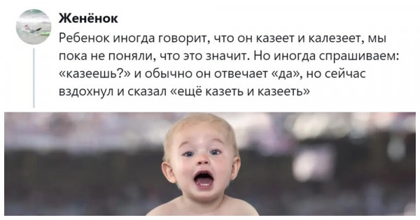 Подросшие дети категорически отказываются от авторства, когда им рассказывают о лингвистических шедеврах, сочинённых в нежном возрасте. Некоторые выражения удаётся расшифровать, другие остаются покрыты мраком тайны. Пользователи вспоминают и делятся наблюдениями в этой области, доказывая, что глубину детских талантов невозможно измерить.
