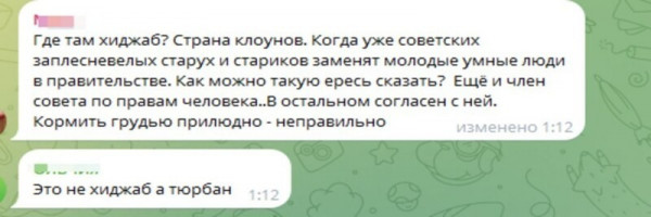 Член Совета по правам человека Марина Ахметова в своём Телеграм-канале заметила, что транслируемый образ скромности, которым обычно апеллируют в защиту платков и хиджабов, как-то не вяжется с поведением женщины."Сами в хиджабе, но грудью ребенка в общественном месте кормим. Я не против кормления ребенка где угодно, раз он хочет есть. Но, на мой взгляд, это действо - таинство, сокровенное, и если его можно совершать не прилюдно, то лучше не прилюдно. Впрочем, таким же таинством является и молитва, и она тоже не подходит для публичных мест. Этот аргумент у меня был заготовлен впрок, чтобы сказать когда-нибудь сторонникам публичной молитвы - вам же не нравится, когда женщина оголяет грудь, чтобы покормить ребенка в общественном месте, так и нам не нравится, когда сокровенную молитву совершают демонстративно. Однако это фото обезоружило меня, стерло мой аргумент. Можно быть в хиджабе и не смущаться открытой груди. Для мусульманки это невозможно. Что еще раз подтверждает: многие верующие, для которых важна внешняя, атрибутивная часть - лишь формально верующие. Хиджаб - лишь поза. Ни в чем другом себя ущемлять эти люди не собираются", - написала Ахметова в соцсетях. В соцсетях по поводу этого фото развернулась целая дискуссия. Одни комментаторы утверждали, что ничего сакрального в кормлении грудью в общественном месте нет - младенцы порой требуют еды не по расписанию. Другие настаивали, что женщина могла бы прикрыть себя, чтобы не светить обнажённым телом. Ну и многие написали о том, что кормящая на голове носит платок, а не хиджаб (видимо, это что-то меняет).