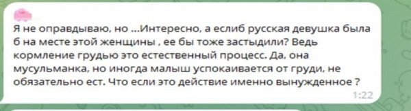 В соцсетях заметили: сама в платке, а ребёнку даёт грудь прилюдно. Как говорится, либо крестик сними, либо трусы надень.