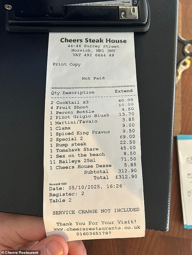 Вечером 5 октября в ресторане Cheers в Норидже собралась компания из четырёх женщин с детьми. Гостьи сытно отужинали, но не оплатили огромный счёт, в который входили стейки, десерты и коктейли. Владелице заведения, Андреа Мариньо, пришлось заплатить 312 фунтов стерлингов (более 33,5 тыс. рублей) из личных средств.