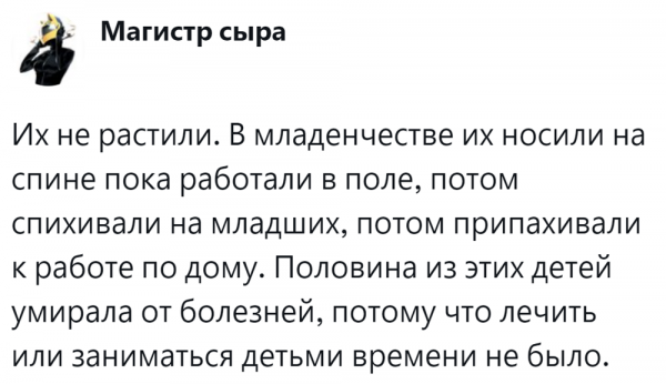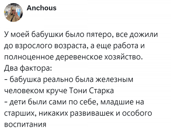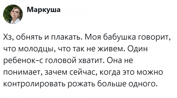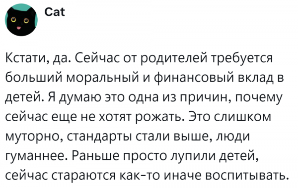 В чём причина? Один из авторов попытался проанализировать её в разрезе снижения рождаемости по причине растущей автономии женщин, живущих без поддержки от партнёра и государства. Но у него тут же нашлись оппоненты, один из которых привёл в качестве примера свою бабушку, в одиночку вырастившую 8 детей. Автономия позволяет женщинам не повторять такой сценарий. Но при этом поборники многодетности, желающие, чтобы воспитанием детей занимались исключительно женщины, не готовы вернуться к тому уровню жизни, медицинского обслуживания и социальных гарантий, который был у той условной женщины с 8 детьми.