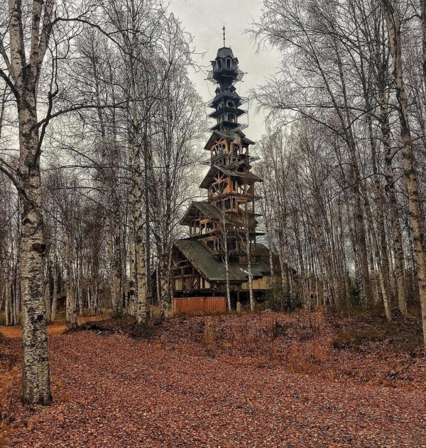 Башня стоит посреди леса, а принадлежит местному адвокату Филиппу Вайднеру. Высота конструкции 56 метров - по словам автора, мог бы сделать и выше, но дальше уже идёт федеральное воздушное пространство.Все началось с того, что Фил купил участок земли к югу от Талкитны. Здесь на берегу реки он решил построить себе двухэтажный деревянный дом. Мужчина имеет степень инженера Массачусетского технологического института, поэтому все чертежи делал самостоятельно. В процессе стройки фантазия разыгралась не на шутку. Вскоре у его избушки появился третий этаж. А затем еще и еще. На каждом уровне открывается панорамный вид с обзором на 360 градусов.Зачем же Вайднеру нужен такой дом? У мужчины грандиозные планы для этого места. На самом верху он хочет установить телескоп, а ниже оборудовать радио будку для своей станции Radio Free Goose Creek. Кстати, в доме есть подвал с туннелем, ведущим в подземное убежище. Мужчина явно готовится на все случаи жизни. Дом еще недостроен. Когда там можно будет жить, Вайднер не знает. Он просто получает удовольствие от самого процесса.