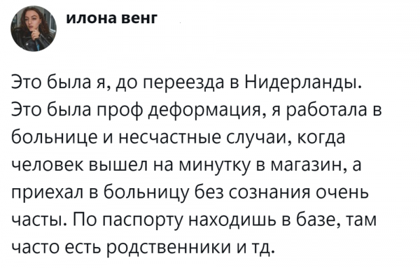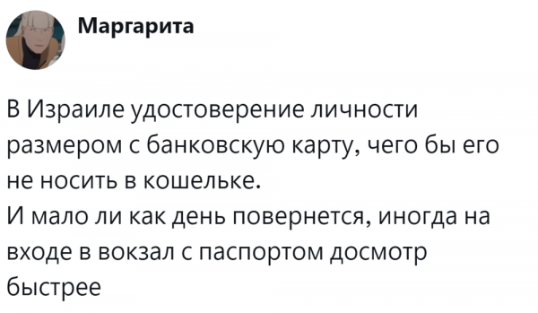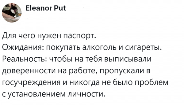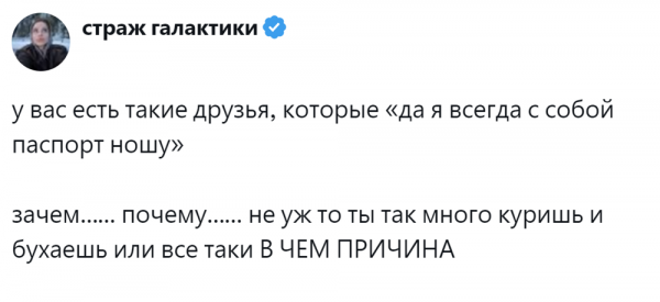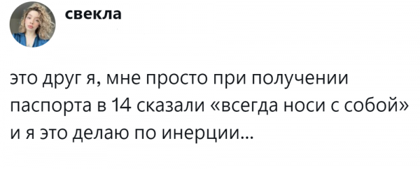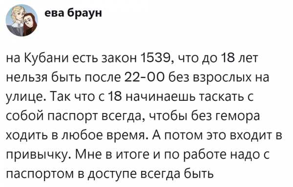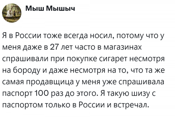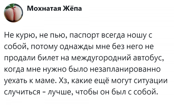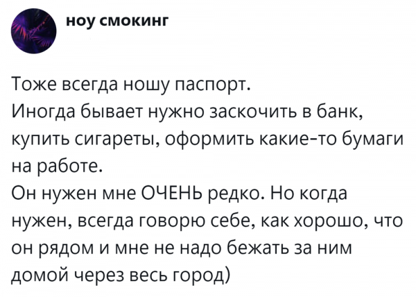 В связи с чем у народа разгорелся интересный спор. Зачем постоянно носить с собой паспорт? Что это даёт - перестраховку, уверенность, чувство безопасности? Или же человек знает за собой какие-то грешки и пытается подсознательно продемонстрировать, что он хороший, благонадёжный и законопослушный?
