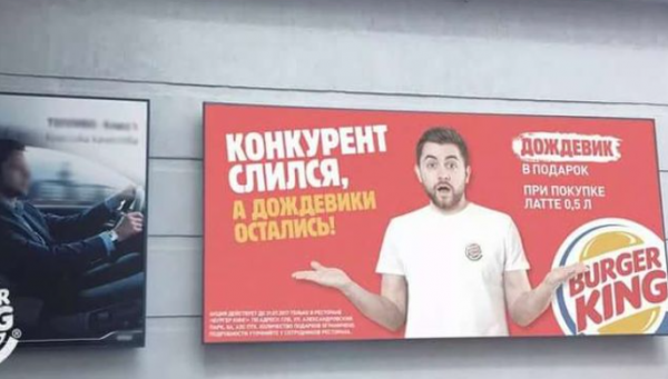 "Бургер Кинг" троллит "McDonald's"А эта интересная реклама была когда-то давно замечена в Санкт-Петербурге. Рядом с рекламой "Макдака" конкуренты разместили свое объявление, предлагая дождевик в подарок вместо очков, которые предлагают конкуренты.
