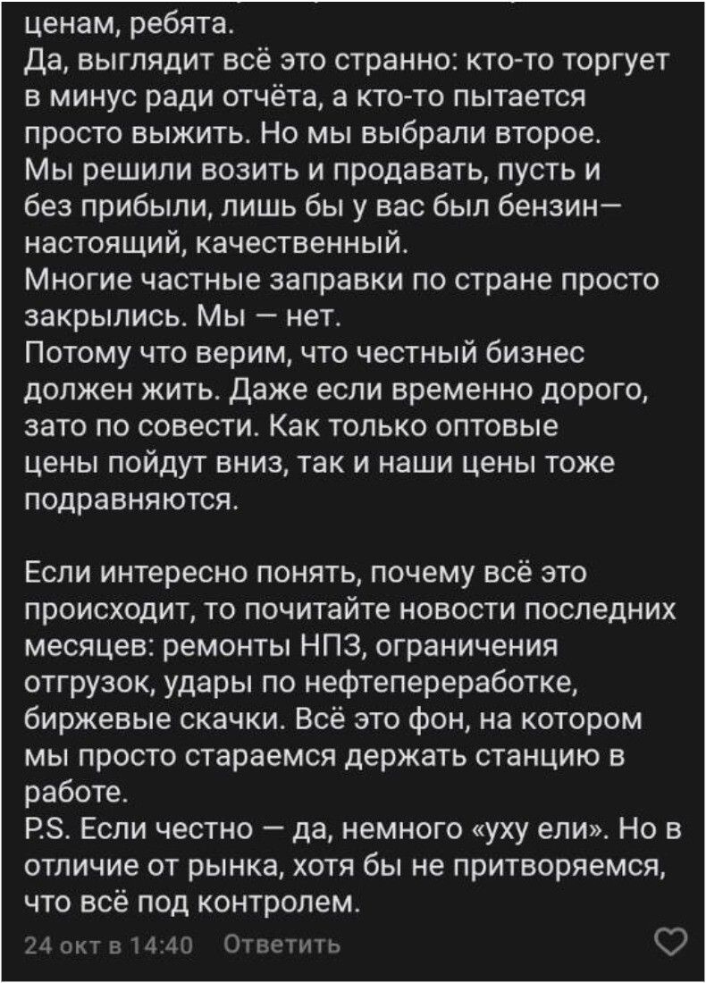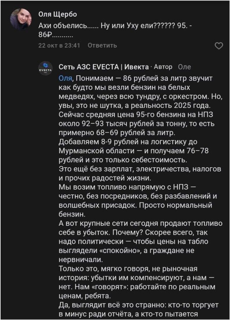 В Мурманской области обнаружили самую честную АЗС: владелец объяснил, почему бензин АИ-95 стоит 86 рублей. Не жадность, а суровая реальность. Народ в комментах возмутился высокой цене на заправке, но у администрации сети заправок тоже наболело, вот и появился такой весьма эмоциональный монолог. "Понимаем, 86 рублей звучит, как будто мы везли бензин на белых медведях через тундру с оркестром".