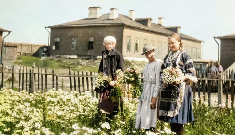 Русские девушки собирают цветы возле казарм Карельского легиона, сформированного британским военным командованием. Север России, Кемь. 1918-1920 год.