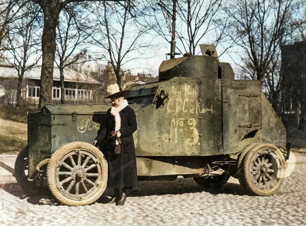 Дама на фоне броневика красногвардейцев у ресторана Эспиля. Выборг, 1918 год.
