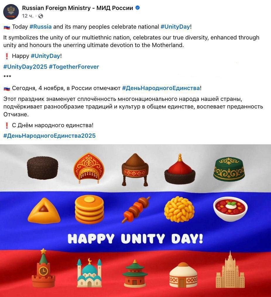 В официальном телеграм-канале Министерства иностранных дел РФ ко Дню народного единства опубликовали поздравление, вызвавшее широкий резонанс и критику за отсутствие символов, отражающих православие - религию большинства россиян. На изображении представлены символы ислама, буддизма, коммунистическая символика, а также традиционные национальные элементы народов России, однако иудаизм, православие и другие традиционные конфессии России оказались проигнорированы.