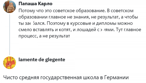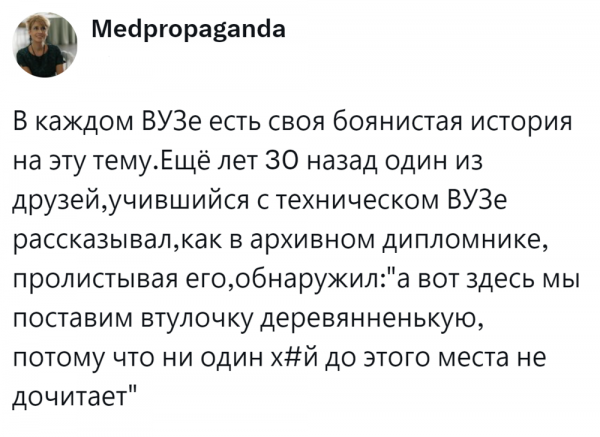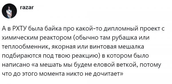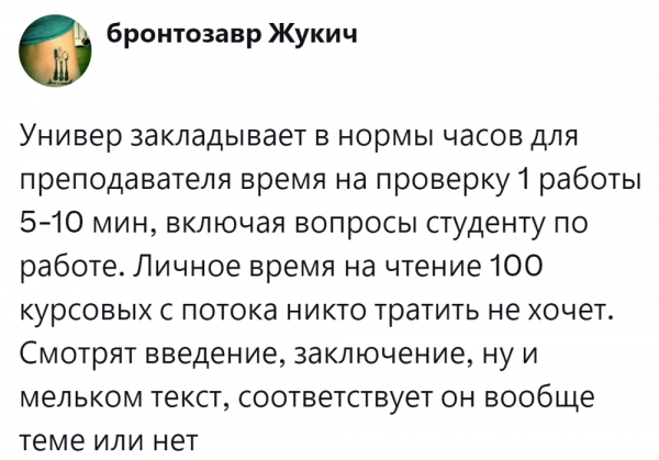 Конечно, речь о противостоянии между преподавателями и студентами. Первые стараются, чтобы в буйных головах молодого поколения осели хоть какие-то знания, а вторые включают фантазию на полную, чтобы получить высшую оценку и при этом напрячься по минимуму. Так, в качестве ответной реакции на тщательную проверку работ студиозусы испытывают преподов на прочность, включая в тексты курсовых информацию, которая, мягко говоря, не имеет ни малейшего отношения к теме и дисциплине в принципе. Если преподаватель заметит, всегда можно отмазаться, сказав, что младший брат поиграл с компьютером. Или котёнок пробежал по клавиатуре. А если нет, то с написанием следующих работ можно не напрягаться. Пользователи поделились своим опытом в этой части и обсудили возможные последствия таких экспериментов.