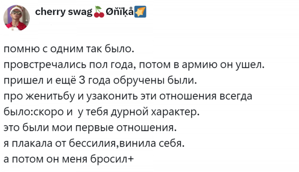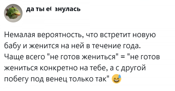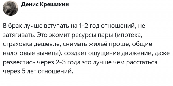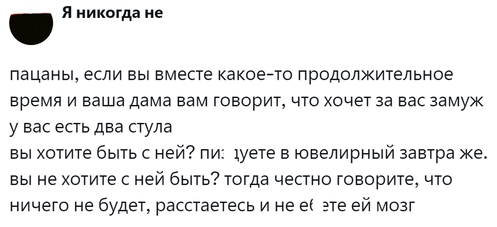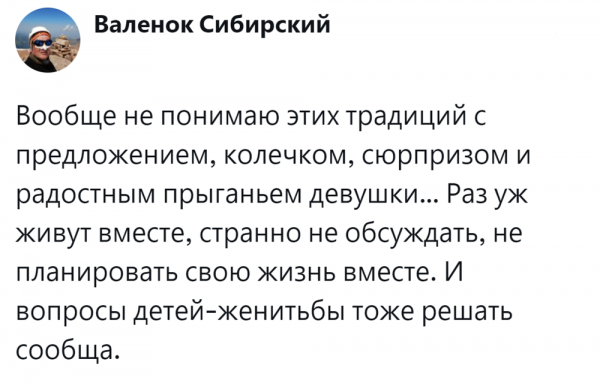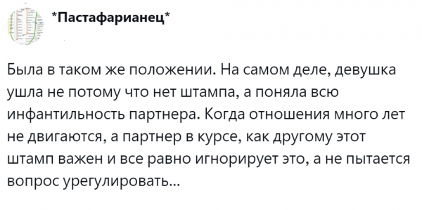Но в последнее время наблюдается тенденция избегания регистрации брака со стороны мужчин. Конечно, одно дело, если партнёры уже взрослые, с детьми, определённым жизненным опытом за плечами и договариваются о гостевом браке на берегу. Но когда несостоявшаяся невеста и жена разрывает отношения, не желая больше находиться в неопределённом статусе, то парни огорчаются и недоумевают. Дескать, всё же хорошо было, чего ей не хватало? Да и предложение я бы сделал, только позднее. Наверное. Пользователи обсудили вопрос неоправданных ожиданий и вскрыли немало социальных и психологических проблем, которые связаны не только с пресловутым штампом.