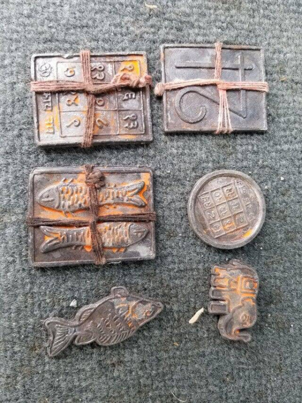 Видел такие несколько недель назад. Не помню, из какой они религии, но это штуки, которые кидают в воду на счастье или просто во время молитвы. Они дешёвые и не несут никакого значения после того, как их кинули в воду. Так что их можно оставить себе. И нет, они не древние.