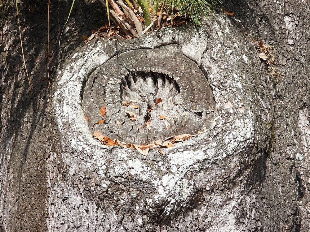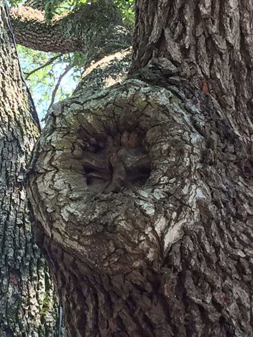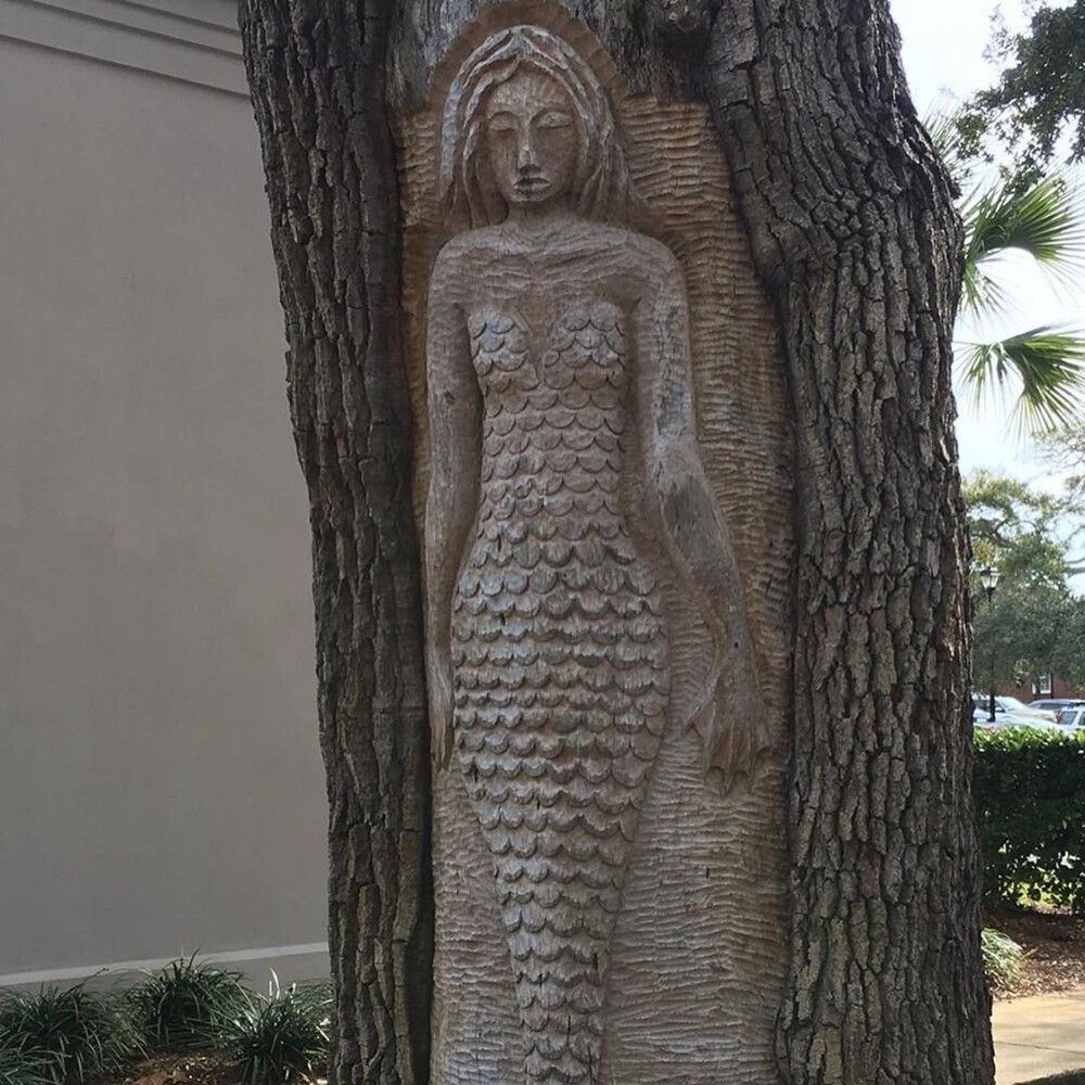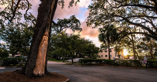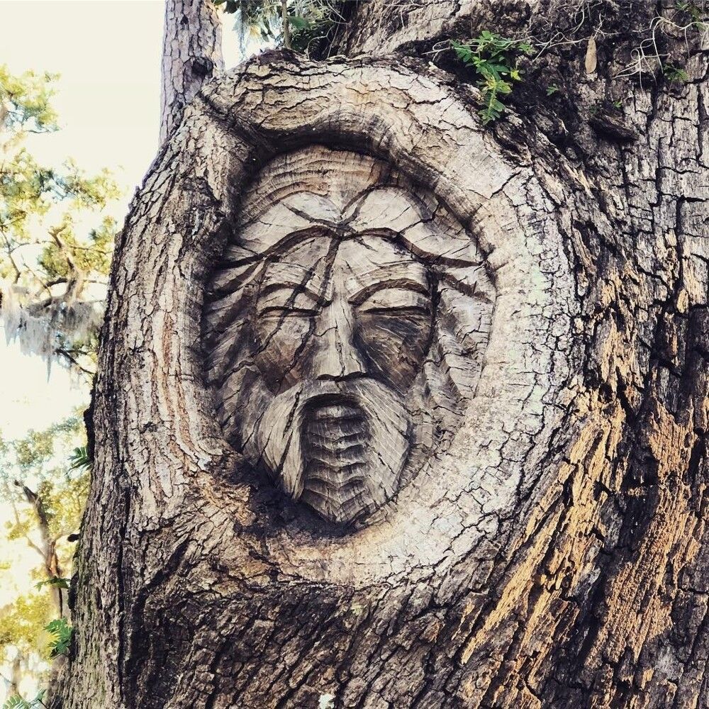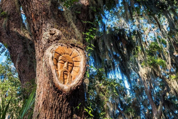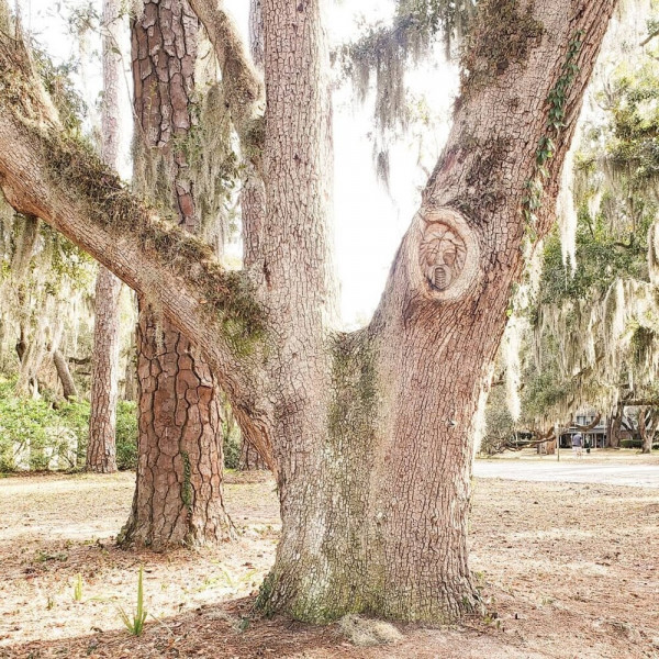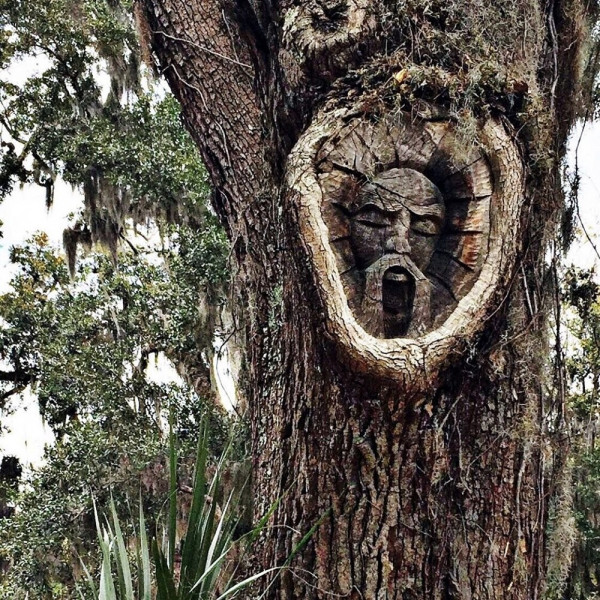 На острове Святого Саймона, барьерном острове у побережья Джорджии, прямо из глубин стволов старых раскидистых дубов на прохожих взирают вырезанные лики.