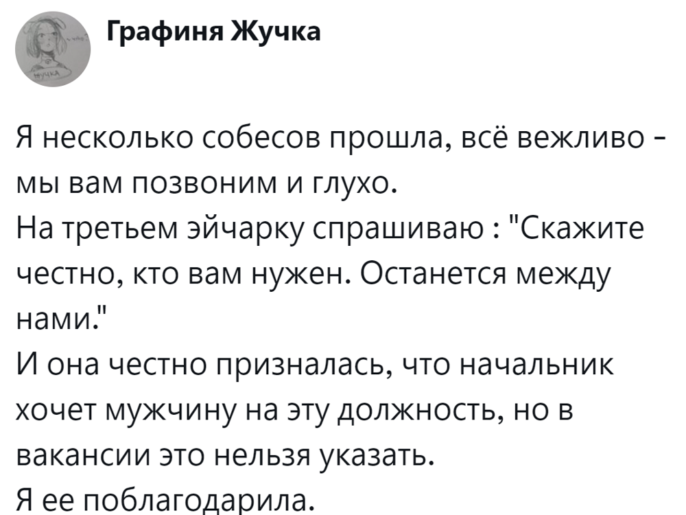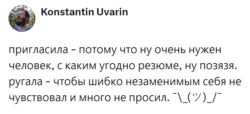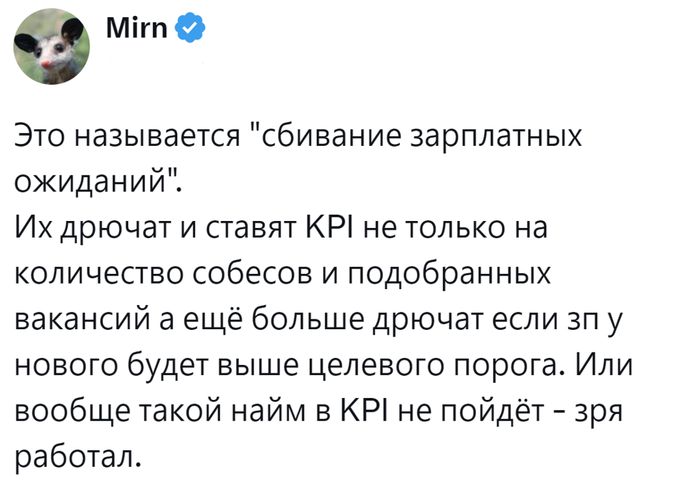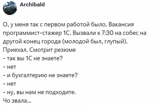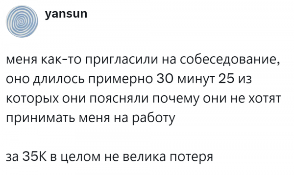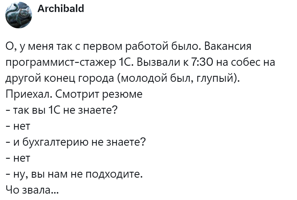 А вот с последним нередко возникает проблема. На собеседовании менеджер по персоналу вдруг начинает предъявлять претензии по поводу последнего. Дескать, опыт кандидата не соответствует предлагаемой вакансии. Хотя в резюме всё чётко указано. Да в телефонном разговоре эти моменты предварительно выясняются, чтобы не тратить время друг друга. Пользователи поразмышляли об этой странной тенденции, предложили свои версии и сошлись во мнении, что причина чаще всего банальная - поменьше платить и заставлять побольше работать.