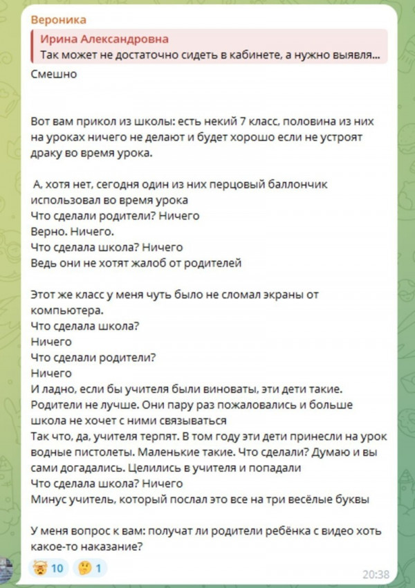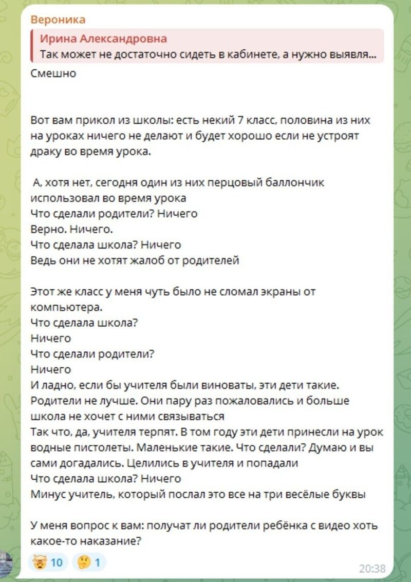 В подмосковном Раменском произошёл серьёзный конфликт между девятиклассниками: во время перемены один из учеников напал на одноклассника с перочинным ножом. Инцидент случился в раздевалке школы поселка Дружба, где после ссоры подросток стал размахивать ножом и несколько раз ударил товарища по лицу, причинив ему травмы - по белой кофте пострадавшего была видна кровь.Видео школьной драки распространилось в соцсетях, вызвав бурную реакцию среди пользователей и родителей. Интернет-пользователи удивлялись реакции педагога, сетовали на отсутствие воспитания детей со стороны родителей, ругали школу, в которой школьникам не обеспечена безопасность.