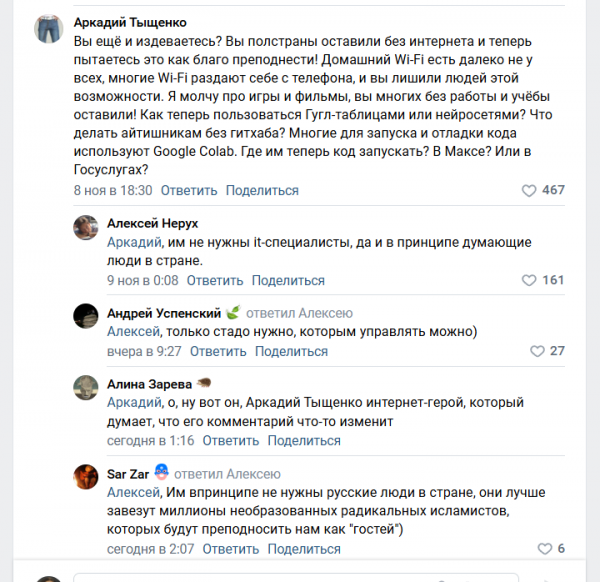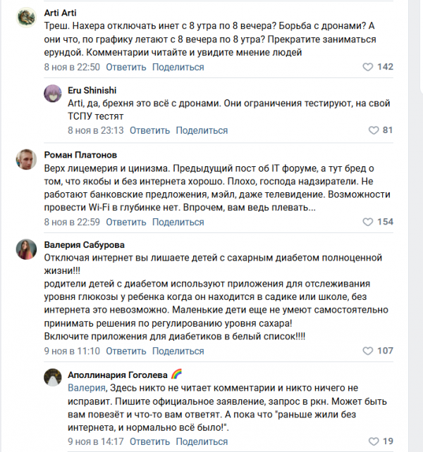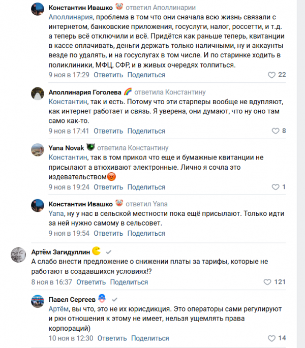 Эта публикация вызвала настоящий шквал комментариев, в которых пользователи жаловались, что уже давно живут в "празднике без Wi-Fi" и мобильного интернета. Во многих регионах последнего нет несколько месяцев. Страшнее всего, когда эти удалённые места не оснащены проводными сетями, и фактически у людей нет возможности выйти в интернет в общем и целом.