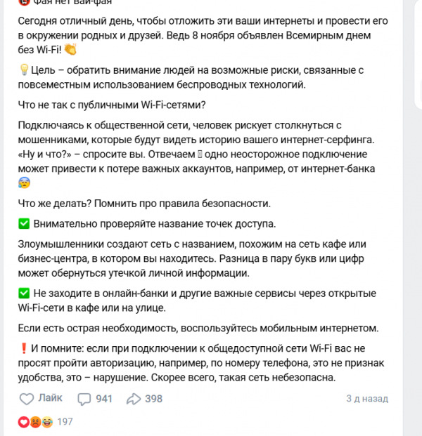 8 ноября объявлен Всемирным днем без Wi-Fi, и Роскомнадзор запостил духоподъемные картинки в честь праздника. РКН рассказал, как хорошо, когда отсутствует Wi-Fi b мобильный интернет - у человека появляется время пожить для себя, заметить то, на что раньше не было времени.
