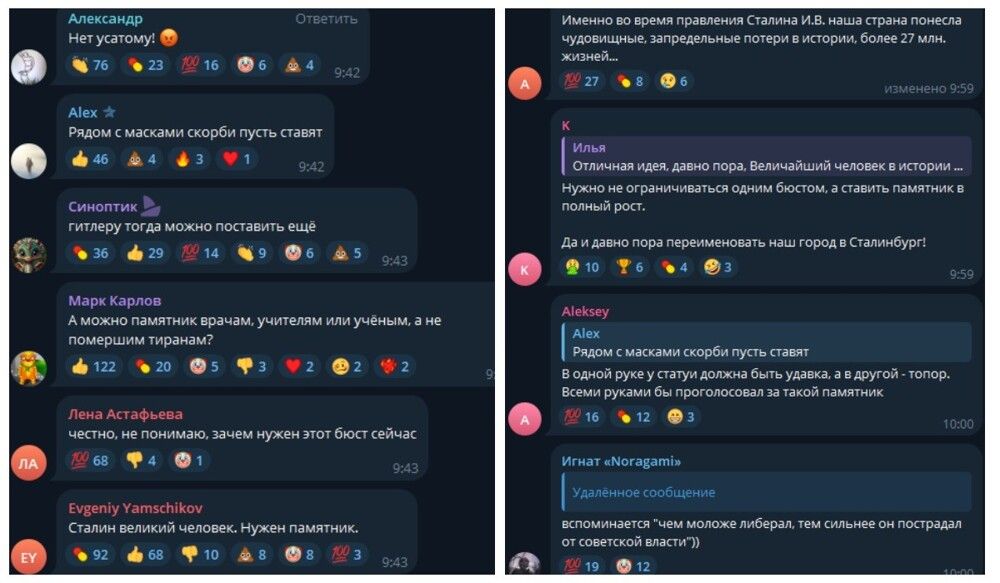 Депутат Александр Колесников заявил, что не смотря на неоднозначность фигуры Иосифа Сталина, он проголосует за установку памятника. "Решение будет принимать комиссия. Сталин - это не грузинская фигура, это общероссийская, общесоветская фигура. Локация на Уралмаше мне не нравится, сразу вам говорю. Вот у Дома офицеров она более уместна, но будем обсуждать", - сказал он.Также Колесников отметил, что установку бюста не будут выносить на городское голосование, чтобы не превращать процесс в балаган."Зачем? Фигура неоднозначная, я согласен, но в балаган превращать все эти вещи я не считаю нужным. Тем более, у Дома офицеров есть барельеф со Сталиным. Я не буду возражать, если будет выбрано место у Дома офицеров. Там это на месте, всё-таки Сталин был главнокомандующим в Великой Отечественной войне, несмотря на его неоднозначность. Если комиссия примет решение по такой локации, я за неё проголосую", - добавил он.