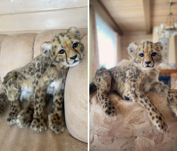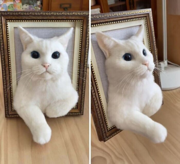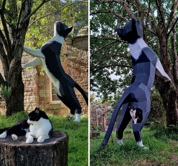 Корпус выполнен из листовой стали толщиной 3 мм и напоминает бумажную поделку. Мои кошки играют внутри него. Одна забирается на дерево, а другая пролезает через нижнюю лапу, проникает в голову и пытается столкнуть первую.