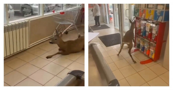 Косуля несколько раз пыталась выбежать обратно на улицу, но врезалась в стеклянные двери. В итоге она всё-таки смогла найти выход и скрылась.