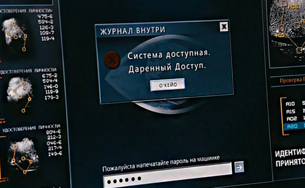 И снова перед нами фильм "Напряги извилины". Здесь прекрасно всё, особенно "Дарёный доступ". Хотя, вероятнее всего, имелось в виду "Доступ открыт". Ну и фраза "Пожалуйста, напечатайте пароль на машинке" - это просто нечто.