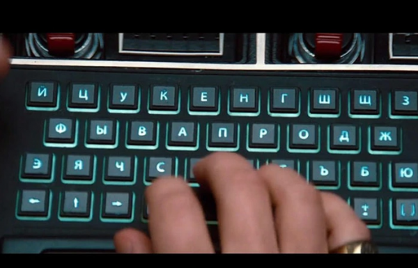 Кадр из фильма "Миссия невыполнима: Протокол Фантом". Да, здесь нет надписи, но раскладка клавиатуры более чем странная. Вроде бы и похожа на нашу, но чего-то в ней не хватает. А не хватает здесь четырёх букв.